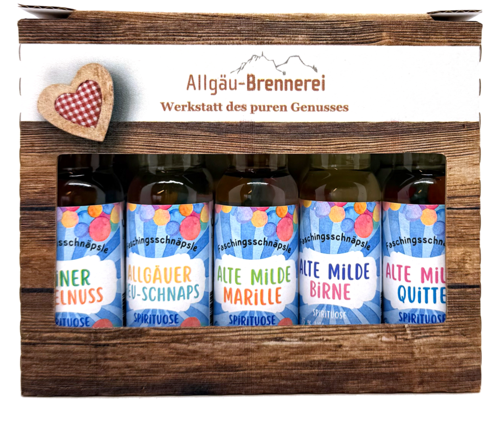 Die Allgäu Brennerei hat sich für die närrische Zeit etwas ganz Besonderes einfallen lassen. Ein Probier-Set mit zehn ausgewählten Allgäuer Destillaten und Likören in handlichen 20-ml-Fläschchen, das mich direkt begeistert hat. Von fruchtig und mild bis kräftig und würzig ist alles dabei, was eine gesellige Runde bereichert.
